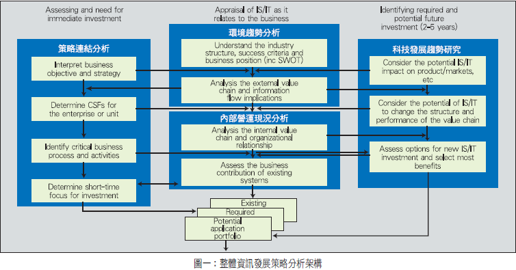 圖一所示為資訊發展策略規劃的一般性分析架構。整個架構可用橫向及縱向二個維度來看,以縱向來切割可分為左、中、右三個分析象限:
