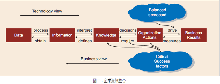 相信透過上述策略連結分析中所介紹的價值鏈分析、關鍵成功因素分析、SWOT分析以及BSC分析等步驟,不但可盤點出企業各項營運活動與所需的各項資料、資訊與知識,而企業e化的規劃者定能對企業資訊整合有更整體性的了解與掌握,如圖2所示,從企業營運的角度,以關鍵成功因素串連營運願景與目標;從資訊科技的角度,以BSC衡量各項資訊建置的績效,確保資訊技術以及企業營運能更緊密地接合。