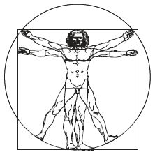 古代數學家根據埃及金字塔的高度與底邊所發展出的「黃金比例」(高度:底邊=1:1.618),最能在人類視覺心理上符合均衡穩定的美感。如將「黃金比例」化成整數,便接近於2:3、3:5、4:6…等尺寸關係,亦可以將此比例套用在人體的理想標準上,例如肚臍以上應佔全身的2/5,肚臍以下應佔全身的3/5。文藝復興時期,達文西更將人體的比例做更精確的描述,提出「人體方圓說」(詳見:右圖),指出人的雙手展開恰等於身長;人體四肢展開以肚臍為中心,恰可繪製出一個圓。另外,在中國,元朝王繹於相法一書中提到,「寫真之法,先觀八格,次看三庭。眼橫五配,口約三勻。明其大局,好定分寸」。中外學者相繼以數學比例說明視覺藝術美感的呈現。將比例的概念套用到系統畫面的視覺呈現上,亦能讓使用者產生舒適的視覺效果,再加上,系統畫面的視覺呈現原本就需要程式數學運算後所產生的結果,因此,在畫面的安排上更著重於精準的計算。