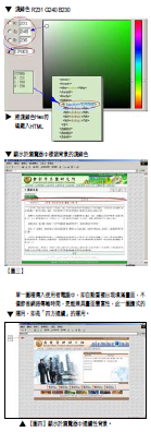 • 網頁色彩的呈現是經由螢幕色碼轉換的結果─由於電腦螢幕是以發光的方式呈現色彩,利用RGB(紅藍綠)的色光混合方式,這也是機械式的色彩溝通方式。在網頁色彩上,則需再將欲呈現的色彩轉換成Hex色彩符碼,方可讓程式碼解讀進而轉譯成機械能閱讀的語言,進而在畫面上呈現出色彩。(詳見圖三)這與一般油墨印刷的CMYK(青洋紅黃黑)的色墨混和方式不同。