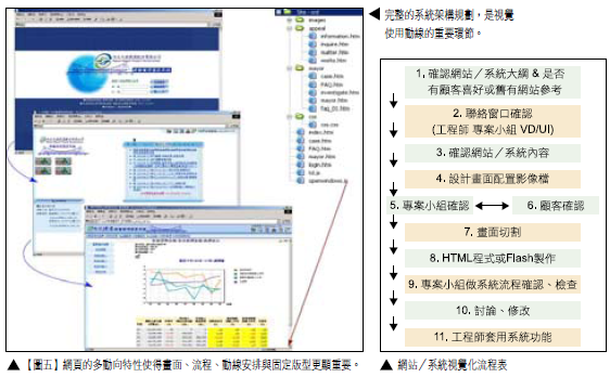 一般網站/系統視覺化在規劃進行時,叡揚VD/UI(視覺設計暨人機介面部)會先根據顧客需求及搭配系統功能,繪製畫面配置的影像檔,經顧客或專案小組確認後,再著手進行畫面切割與HTML程式製作,所完成的程式與圖像檔再交由專案小組之工程師套用系統功能(詳見「網站/系統視覺化流程表」)。倘若顧客無法明確地認可,則極可能再重複執行步驟4~11,直到顧客確認為止。由此可知,顧客對於圖形上的確認是相當重要的!因為這影響到後續的多數系統畫面是否套用統一的視覺風格,甚至操作上的順暢性與正式上線的時程。
