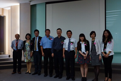 (貴賓合影,左起為逢甲大學圖書館館長 林志敏、叡揚資訊知識生產力國際事業處副總經理 胡瑞柔、叡揚資訊顧問 賴俊仁、逢甲大學前校長 劉安之、叡揚資訊執行長 張培鏞、逢甲大學副校長 邱創乾、台灣中油油品行銷事業處桃竹營業處行政組 張琳雅、叡揚資訊通路與結盟協理 康蘭芬、叡揚資訊雲端服務事業部顧問 陳怡安)