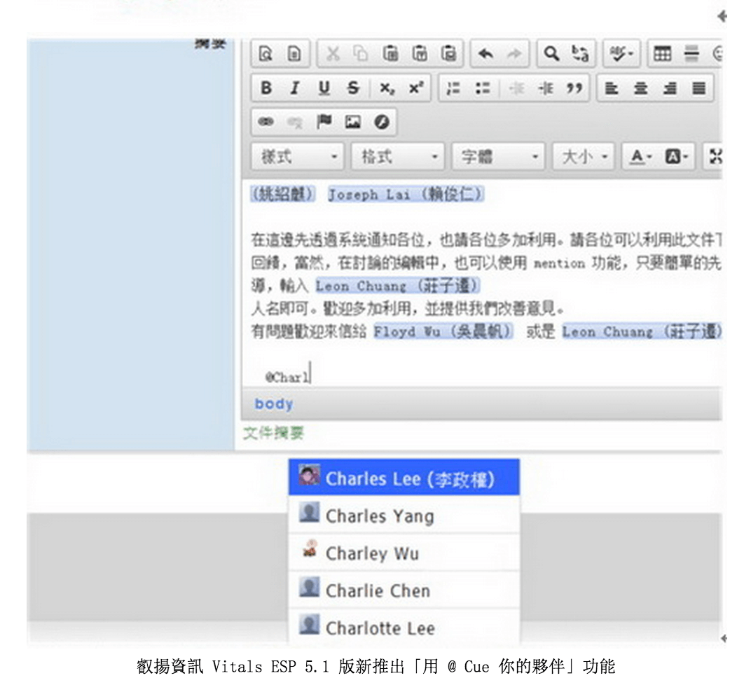 深耕知識內容管理領域多年,累積了兩岸三地及日本眾多導入實績,叡揚資訊察覺客戶強化跨單位、跨區域溝通交流的迫切需求,推出 Vitals ESP 知識管理企業雲 5.1 版,除了原有的知識內容分享、管理功能外,將社群網站 Social 元素適當且巧妙的融入平台,提供有如 Facebook 以 @ 符號呼叫特定成員功能,讓企業內分享、交流變的即時且有趣,大幅提升了平台的參與度與粘著度。