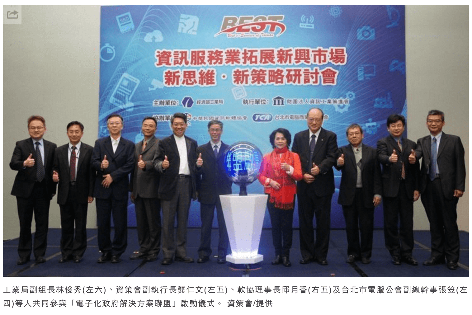 工業局於17日輔導凌群電腦、叡揚資訊等30多家具有電子化政府系統應用實績的國內廠商,組成智慧政府專網、智慧交通、智慧照明、警政安控、食品安全、健康照護及智慧園區等7大拓銷聯盟,並舉辦「資訊服務業外銷聯盟啟動儀式」,宣示協助業者爭取全求電子化政府商機之決心。