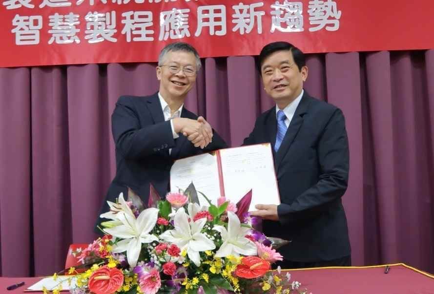 紡織所所長李貴琪(右)與叡揚資訊董事長張培鏞(左)簽訂合作協議書。 李炎奇/攝影