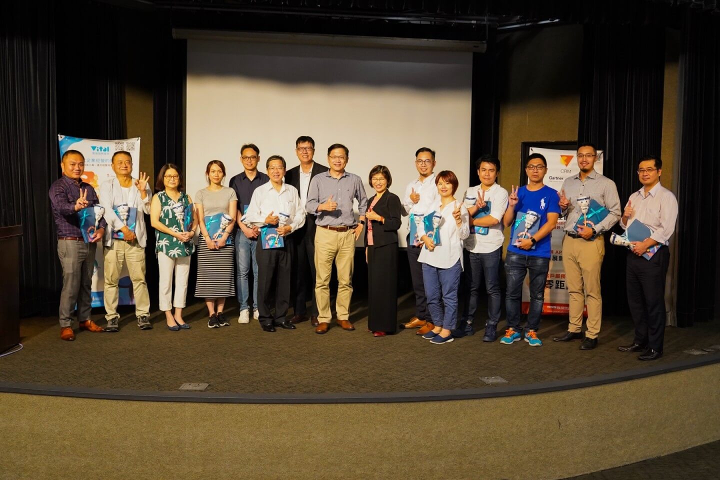 台灣科技大學盧希鵬教授(左8)、叡揚資訊胡瑞柔總經理(左9)與企業代表們共同揭示CRM客戶關係管理成功案例集