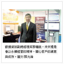 吳黎權說,專案管理、善用資訊科技,及優異的系統架構設計能力所開發出的流程e化與創新應用之系統及服務,搏得金融業、政府、醫院、電信與製造業等客戶的好評。