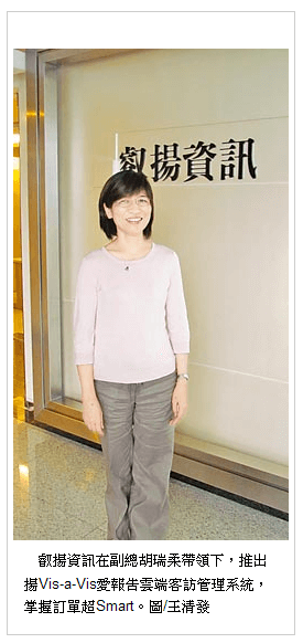 叡揚資訊副總胡瑞柔表示,看準雲端服務及中小企業商機,又鑒於中小企業往往無法投入大量資金人力於客訪商用管理系統,故結合叡揚豐厚經驗及專業技術,打造Vis-a-Vis愛報告(客戶拜訪管理雲端服務系統)。此平台的三大功能為:1.隨時掌握業務活動及週月報,重要指標與待辦的設定,方便使用者跟催,提升內部效率。2.支援各智慧手機與平板裝置,業務能輕鬆隨時回報。同時可選擇轉寄通知或討論留言、做到後勤互動無時差。3.客戶、產品相關提醒,讓每一次拜訪報告一覽無遺且不流失商機,方便留存成珍貴資產與商機。