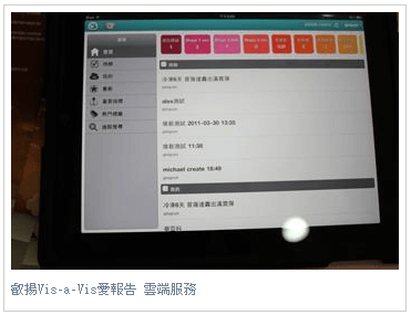 中華電董事長呂學錦強調,雲端是未來五年計畫的重頭戲,雲市集在五年內要達到50億元的規模。叡揚資訊執行長張培鏞也強調,叡揚Vis-a-Vis愛報告這款商務應用雲端服務,價格沒壓力,提供高彈性化的客製化設定及人性化介面,不論是保險業、製造業、服務業、媒體業等各行各業都相當適合Vis-a-Vis愛報告,在類似臉書操作介面的環境下,不但可以輕易管理手中數百位客戶,藉由分類功能,查詢有商機、比價中一點就靈,還有互動留言功能,上下屬溝通無障礙、同事間還可以討論學習,追蹤客戶更快更有效率!