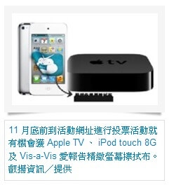 【台北訊】叡揚資訊與中華電信合作,在11月底前只要到visavis.cloudgss.com進行投票活動,就有機會獲Apple TV、iPod touch 8G及Vis-a-Vis愛報告精緻螢幕擦拭布。