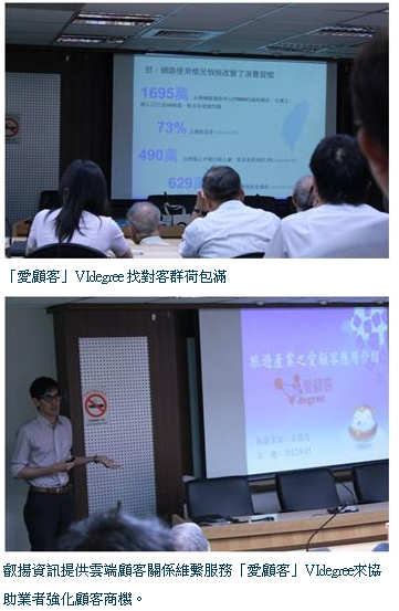 王佑文最後強調,在競爭白熱化的旅遊業環境中,有時不是透過最新奇的旅遊規劃來吸引客戶,而是透過細心、貼心、有效率的客戶管理來打動客戶,提昇客我之間的友好關係,進而搶佔商機。此次王佑文精彩的分享也受到與會來賓的熱情迴響,紛紛前來詢問「愛顧客」VIdegree進一步資訊,並希望藉由這套簡單、方便的雲端客戶關係管理服務工具,在日漸熱絡的兩岸旅遊業務裡脫穎而出,順利搶佔先機。