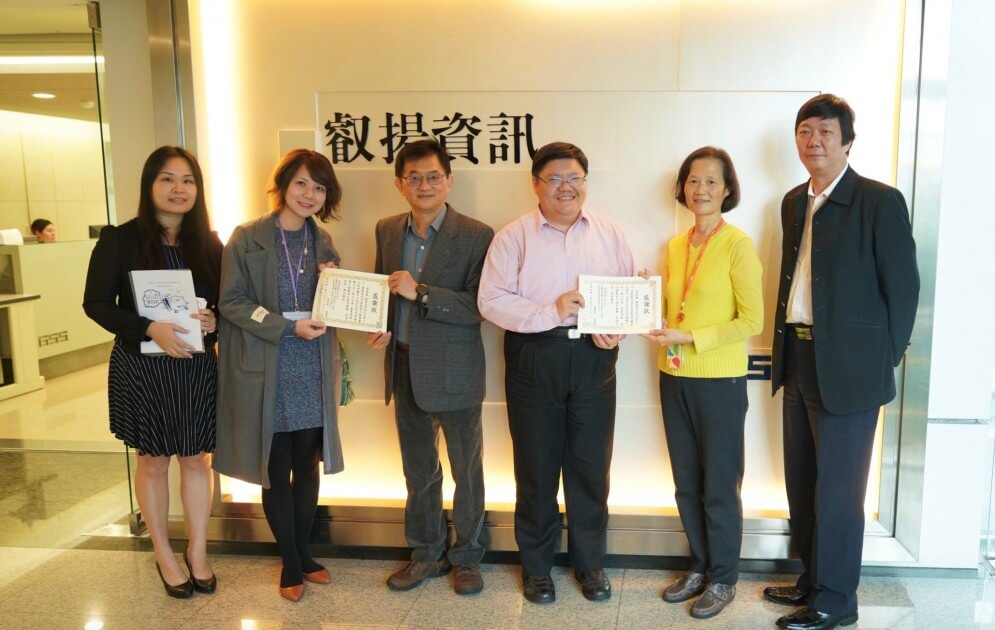 健順體系臺北市南港老人服務暨日間照顧中心副主任郭佩璇(左二起)、網軟股份有限公司副總經理陳永隆、健順體系-臺北市東區家庭照顧者支持中心主任徐國強、叡揚資訊闕蓮香經理合影。 叡揚資訊股份有限公司/提供