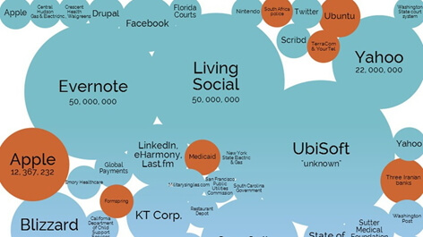 「Information is Beautiful」這個織組中有一組人,將世界上重大的資料外洩事件數量視覺化,匯集成一個非常有趣的圖表,令人大開眼界,它真誠地呈現數據,而不是造成恐慌。這些重大資料外洩事件包含Evernote,LivingSocial,Facebook,LinkedIn,Yahoo以及Twitter。但具有遭攻擊風險的不僅是資訊科技公司。「遊戲網站及公司才是最大的受害者,就被駭的資料量來說,他們敗的一蹋糊塗。」- Information is Beautiful總裁David McCandless接受Mashable訪問時提到。