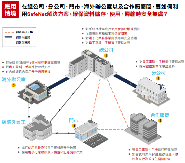 SafeNet 利用全方位安全解決方案,協助企業面對不斷變動的巨大挑戰:藉由多重驗證技術、硬體安全模組(DataSecure/KeySecure)、高速加密器和資料加密解決方案,能協助企業確保客戶隱私,保護客戶的個資、影像和應用程式,並能減少法規遵循的成本和複雜性。