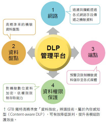 GTB 獨特高精準度「資料指紋」辨識技術,屬於內容感知型(Content-aware DLP),可有效降低誤判,提升各模組防護效益