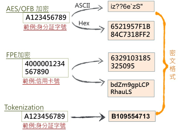 面對眾多資料保護作法,依特性及效能,將會有不同的運用模式,先分別對AES這個老方法及FPE、Tokenization這2種新方法,就明、密文格式議題進行探討、分析如下: