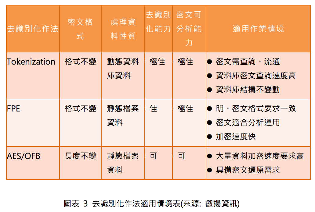 普遍印象中,資料加密後密文通常為變長的亂碼型式,造成資料識別困擾,近期許多產業在加密處理資料時,產生密、明文長度與格式相同的需求;於資料格式及查詢效率等多重考量因素下,檔案型靜態資料與資料庫動態資料保護作法,可能會有不同的抉擇。