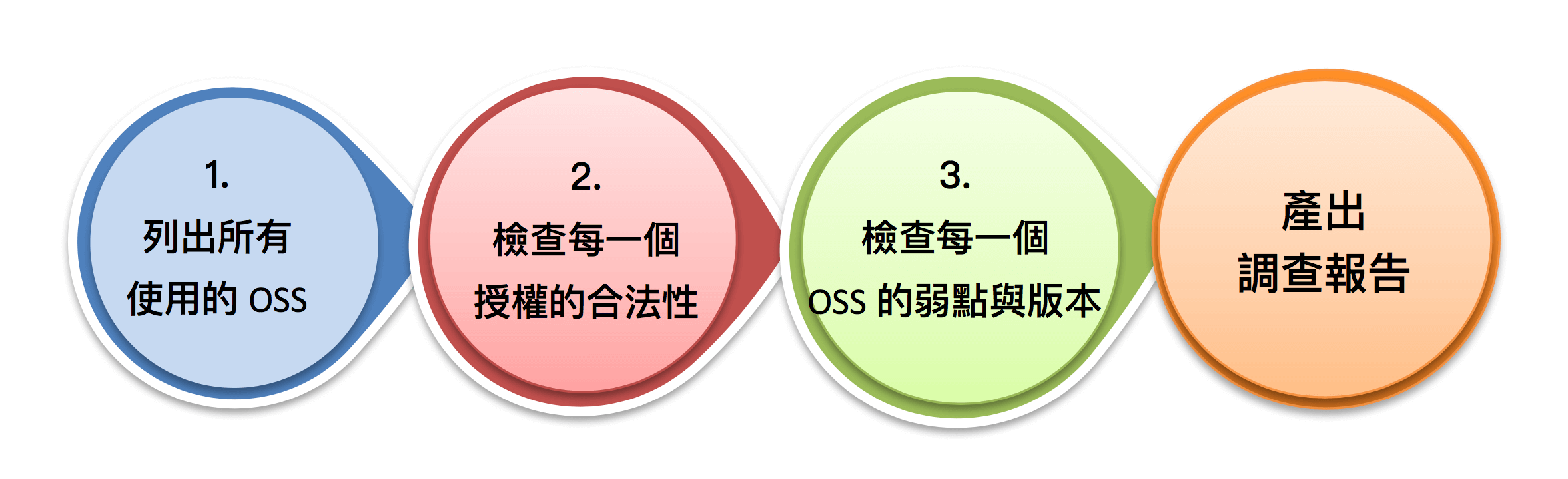 這是最重要的一步,因為如果你不知道有使用什麼OSS,你也無法知道您需要遵守哪些授權範圍,如果這些OSS有任何安全性漏洞會影響您的產品,那麼就應該要考慮更新並隨時注意這元件是否有新版本釋出或是更換其他類似元件。同時也需要注意的是OSS是否有互相依存的關係,是否牽一髮而動全身需調整所有的程式架構。