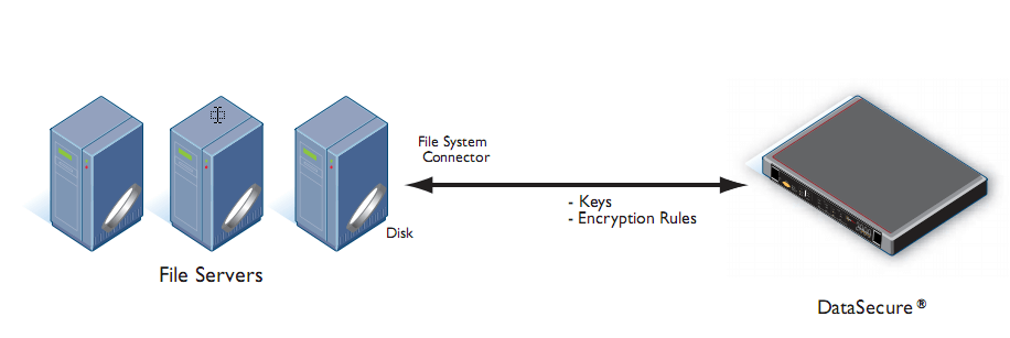 SafeNet的解決方案使用工業標準強化的AES 128以及256 bit 的加密技術來保護伺服器上的敏感性資料,使用者需要存取時,可以透過應用程式進行操作。這個應用程式叫做SafeNet File System Connector (檔案系統連接器) 將被安裝在檔案伺服器的檔案系統層之上。為了確保安全、簡單部署以及後續的管理,金鑰以及加密政策將透過安全強化過的SafeNet DataSecure機器設備進行及集中式管理。