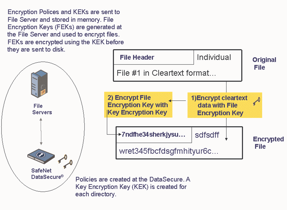 SafeNet ProtectFile一樣使用DataSecure為其加解密核心,它可進行檔案伺服器與端點電腦之間的檔案加密、金鑰、與policy管理。與ProtectDB不同的是,資料加密的對稱性金鑰是本身加密電腦產生的,每個加密檔案都有屬於自己的File Encryption Key (FEK),這把Key被Key Encryption Key (KEK)加密所保護,KEK則是由DataSecure所產生的(如下圖)。