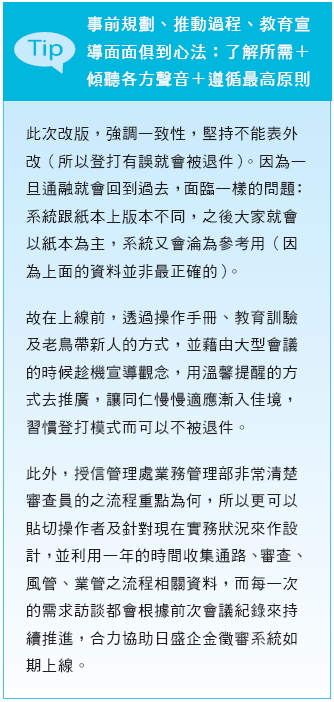 談及推動,授信管理處業務管理部並非業務端 之主管單位,「所以會比較辛苦!」陳靜怡經 理笑笑地說,任何User 對於一套新系統上路 都需要時間適應,「業務端剛開始會排斥,此 乃人之常情,因為這是習慣改變所產生的刻板抗拒現象。」在跨部門溝通上,授信管理處業 務管理部更是小心翼翼比照專案管理教科書高細膩進行,「這次增修案,User 端會在作業 流程上多出幾道手續要做;在這樣的前提下, 不論是需求訪談都要格外重視User 端之需求, 得到共識認同方能穩紮穩打。」業務管理部不 論是在事前功課或是需求修正( 如:會計科目大改版、資金用途整個拿掉、表格比對等等), 都下足功夫一步步沙盤推演到最後階段。