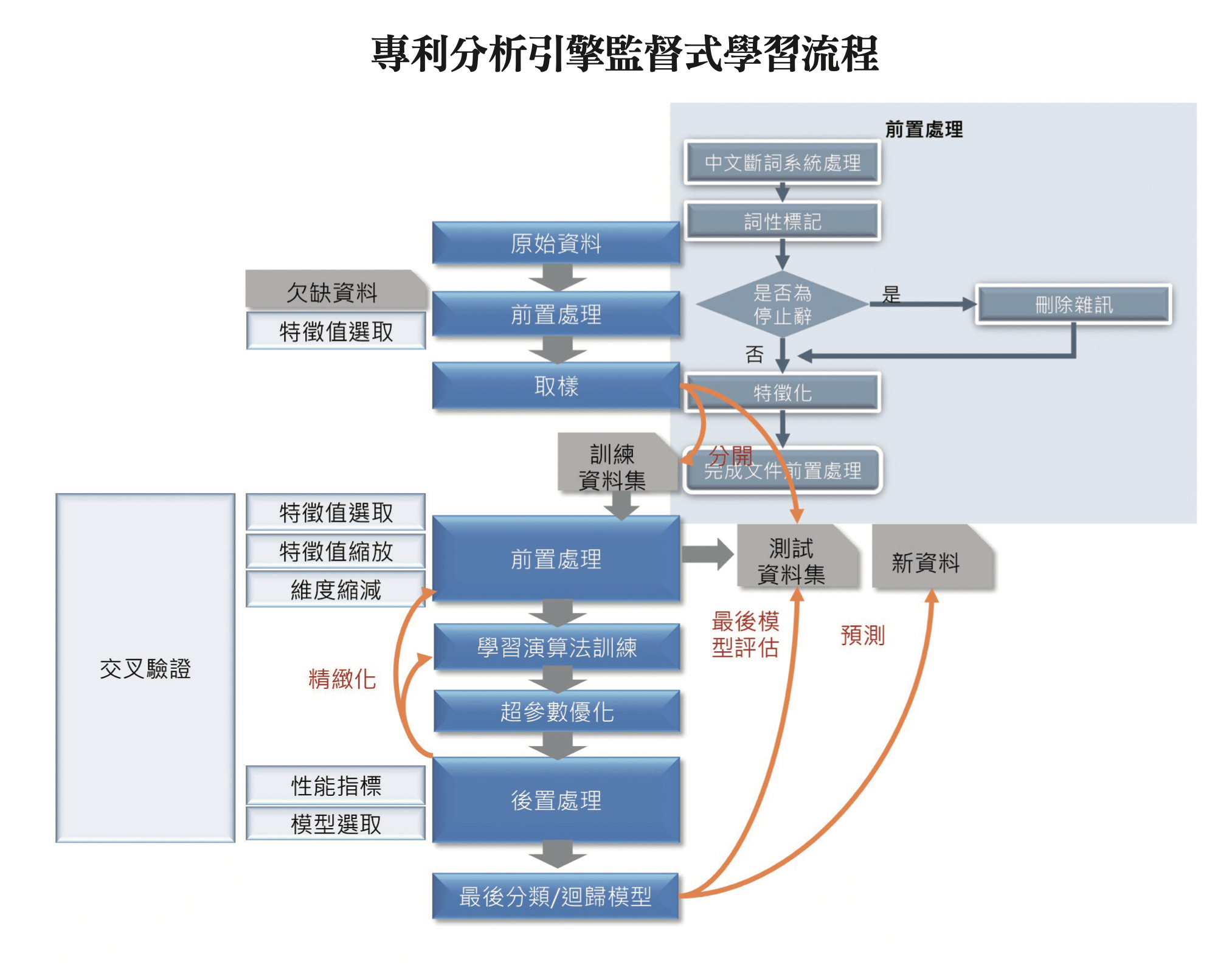 專利分析引擎的技術辭庫自動學習技術主要是自然語言處理中包括分詞/ 斷詞、標註詞性及關鍵詞抽取的技巧;專利自動分類技術則包括文件前置處理、特徵值處理、分類模型訓練及回饋機制的流程。
